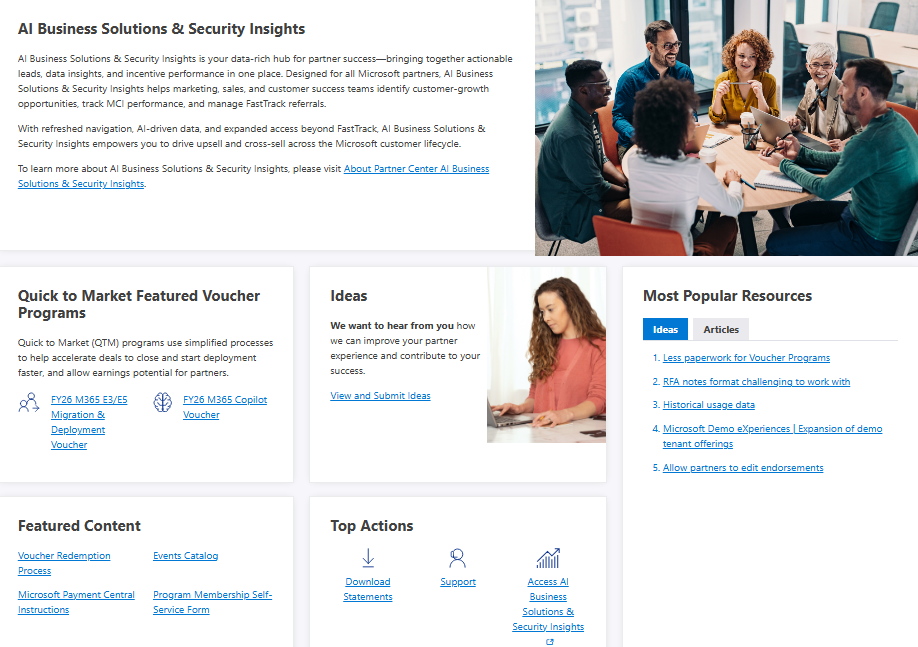 - Top Actions: Access to tools partners use every day: Downloading payment statements, accessing partner support, accessing the AI Business Solutions & Security Insights.